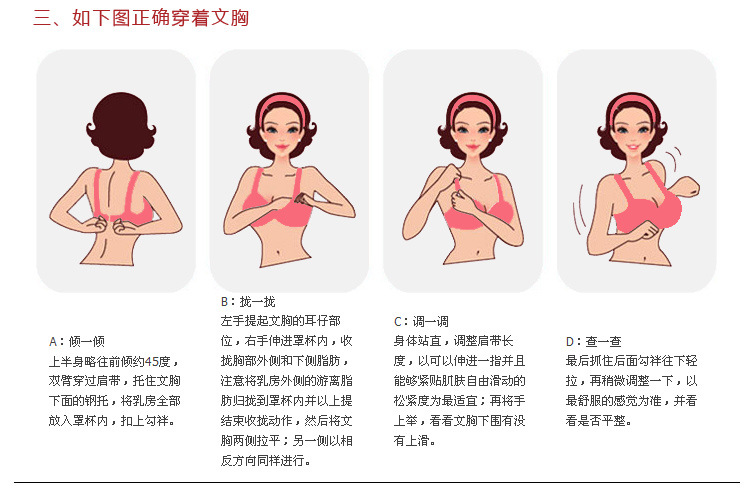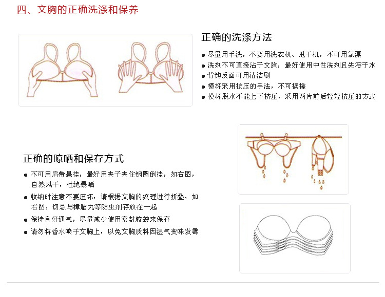 3.太陽(yáng)光的直射是文胸變黃、褪色、布料弱化的原因,室內(nèi)暖氣亦會(huì)造成變黃,請(qǐng)避免。