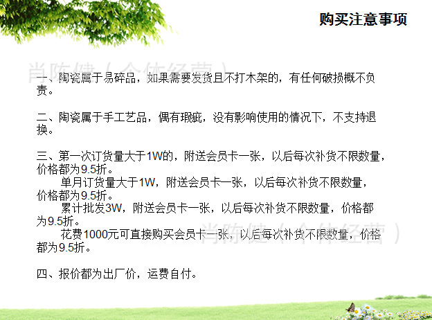 易陶瓷2011年開始,產品價格大幅下降,破損率比較低,所以再次強調破損不保,不退,謝謝理解。