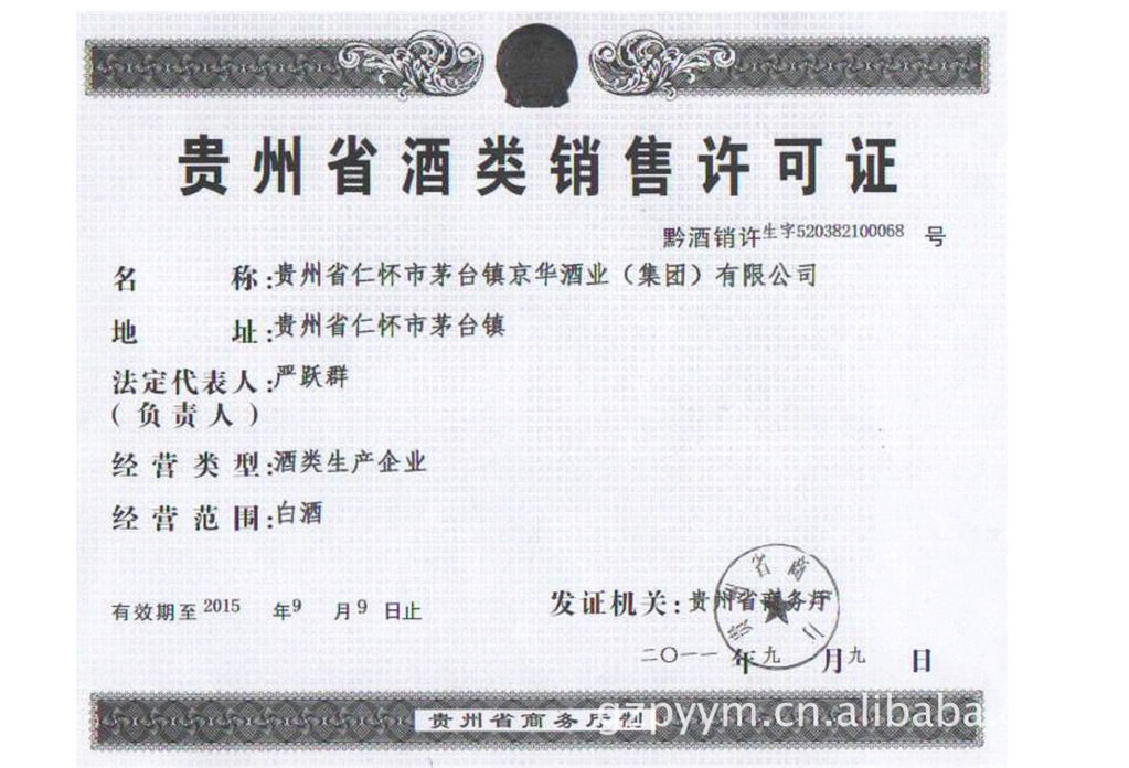 酒廠已通過ISO9001國際質(zhì)量管理體系認(rèn)證和HACCP食品安全管理體系認(rèn)證。生產(chǎn)許可證編號:QS5200 1501 0056食品衛(wèi)生許可證:黔衛(wèi)食證字[2009]第520382-161084號