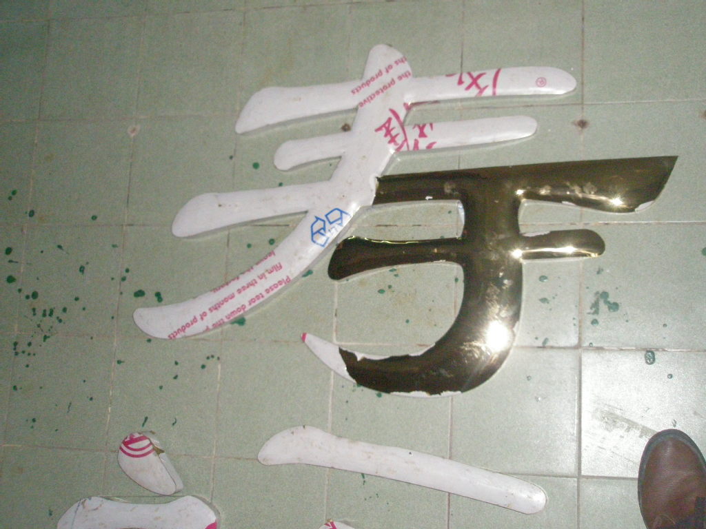 三)下料:把字稿直接貼在鈦金字板上,也可把字稿摹在鈦金板上,字稿四周適應地留出余量,否則字變細,變瘦,然后用電剪子剪成平字