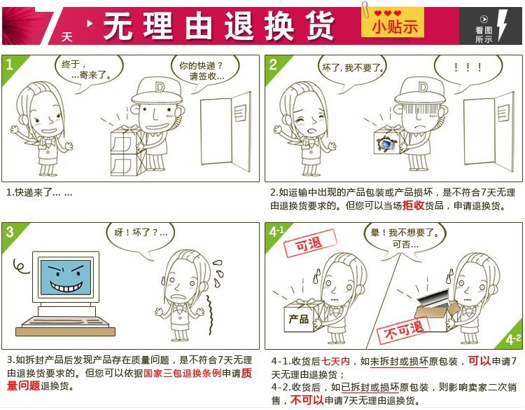 b、關于商品質量問題售后郵費問題,由于網絡薄利經營,加之售后多數需要郵寄,在購買物品快遞簽收的日期開始,7天內本店負責來回郵費,7-14天內各自負責自己發貨的郵費,超過14天買家負責來回郵費,如給您帶來不便敬請諒解。