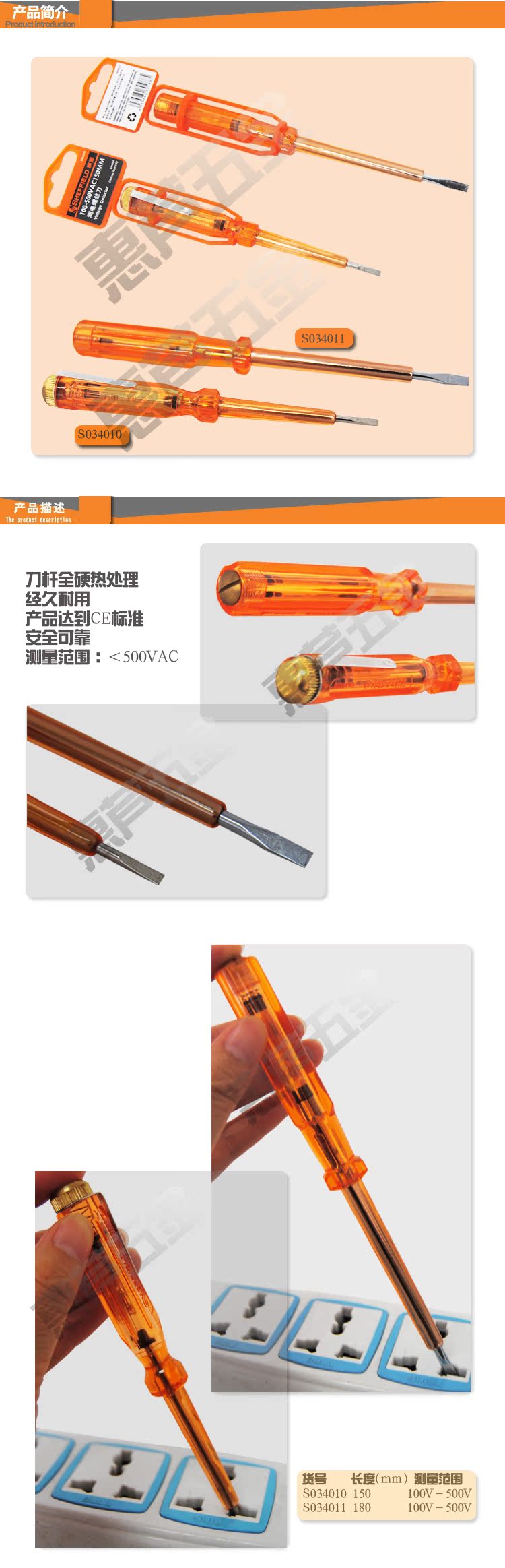 產品參數及特點貨號長度(mm)測量范圍重量kg價格元S034010-W150100V-500V7.92S034011-W180100V-500V8.91