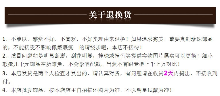 1、不能以,感覺不好,不喜歡,不好賣理由來退換!如果追求完美,或要真的珍珠飾品的,不能接受不影響佩戴瑕疵的請繞步吧,本店不接待!