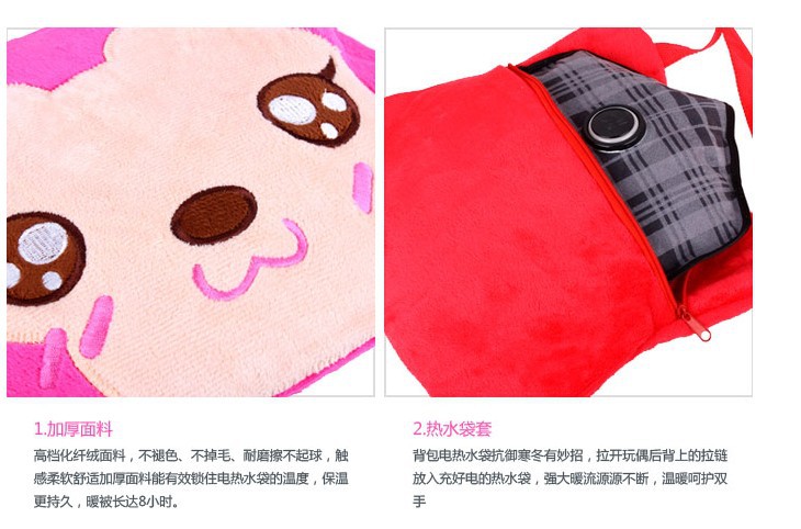 愛 藝背包電熱水袋,超萌可愛小玩偶,為電熱水袋穿上美麗的衣裳,超柔毛絨,質地細膩,手感柔軟。獨創雙插手設計,手心手背均勻受熱,溫暖呵護雙手。采用高新 科技打造,認證自動溫控加新一代防爆技術,使用安全可靠。以高儲能制熱液為發熱體,通過袋內半導體均勻加熱儲能,升溫快、保溫更持久。有效減少凍瘡、關節 炎、慢性胃腸病的發生,有效緩解痛經,具有消除肌肉疲勞和舒展血脈等保[jian]功能,是冬季理想的保暖、熱敷理療輔助佳品。