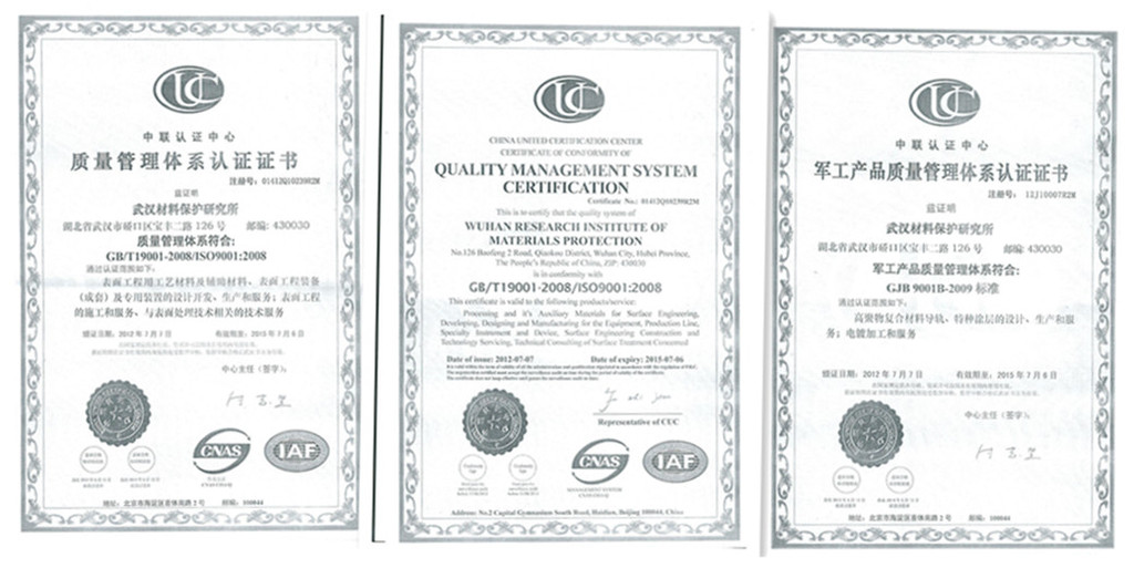 武漢材料保護研究所始建于1953年,原為機械工業(yè)部直屬大型骨干研究所,隨著我國科技體制改革的發(fā)展,轉(zhuǎn)制為科技型企業(yè),現(xiàn)隸屬于國務(wù)院國有資產(chǎn)管理委員會管理的機械科學(xué)研究總院。經(jīng)過50余年的發(fā)展,武漢材料保護研究所已成為表面處理工藝、材料、設(shè)備的研發(fā)與生產(chǎn),表面覆蓋層性能測試、產(chǎn)品質(zhì)量檢測,表面保護工程設(shè)計與施工的高新技術(shù)企業(yè),并通過GB/T19001-2008/ISO9001:2008質(zhì)量管理體系認證,GJB9001B-2009軍工產(chǎn)品質(zhì)量管理體系認證。