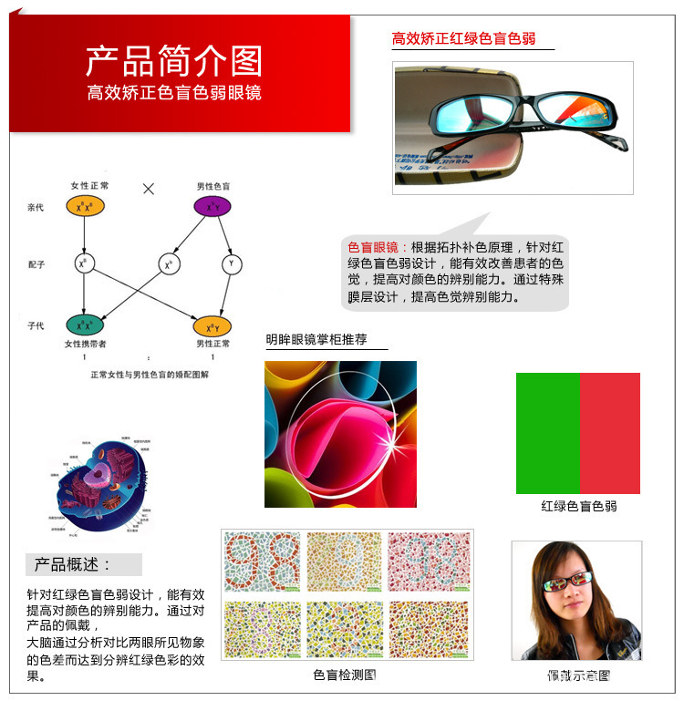色盲矯正眼鏡原理:根據(jù)補色拓撲學原理,在鏡片上進行特殊鍍膜,產(chǎn)生截止波長的作用,對長波長者可透射,對短波長者發(fā)生反射。 戴上色盲眼鏡,可使原來色盲圖本辨認不清的變?yōu)槟苷_辨認。達到矯正色覺障礙的效果。 色盲矯正鏡片是以玻璃鏡片或CR-39超硬樹脂鏡片為基片,經(jīng)過的多道工序加工而成的,主要用于先天性色覺異常患者的色覺矯正,使其能夠達到正常的視覺效果
