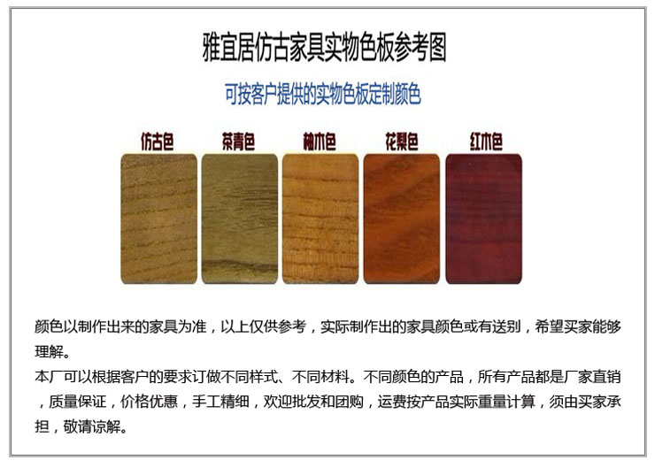 雅宜居古典仿古家具廠位于著名的越劇之鄉--浙江嵊州市,是一家專業生產各種仿古門窗、屏風、掛件、花板、壁掛、明清家具的雕刻木藝品廠家,產品精工細作,別具特色,適用于各賓館、酒店、廟宇、茶樓、園林、家居等裝飾。本廠選料考究,取材于柚木、花梨木、榆木、樟木等名貴木材,經名師的精雕細作,產品古風古韻,體現古樸典雅的特色,也具有很強的現代實用價值。