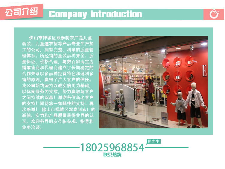 佛山市禪城區(qū)雙泰制衣廠是兒童套裝、兒童連衣裙等產(chǎn)品專業(yè)生產(chǎn)加工的公司,擁有完整、科學(xué)的質(zhì)量管理體系。所經(jīng)銷(xiāo)的童裝品種齊全、質(zhì)量保證、價(jià)格合理,與數(shù)百家淘寶店鋪零售商和代理商建立了長(zhǎng)期穩(wěn)定的合作關(guān)系以多品種經(jīng)營(yíng)特色和薄利多銷(xiāo)的原則,贏得了廣大客戶的信任。我公司始終堅(jiān)持以誠(chéng)實(shí)信用為基礎(chǔ),以優(yōu)良服務(wù)為支撐,努力贏取與客戶之間持續(xù)的雙贏!謝謝各位新老客戶的支持!期待您一如既往的支持!再次感謝! 佛山市禪城區(qū)雙泰制衣廠的誠(chéng)信、實(shí)力和產(chǎn)品質(zhì)量獲得業(yè)界的認(rèn)可。歡迎各界朋友蒞臨參觀、指導(dǎo)和業(yè)務(wù)洽談。