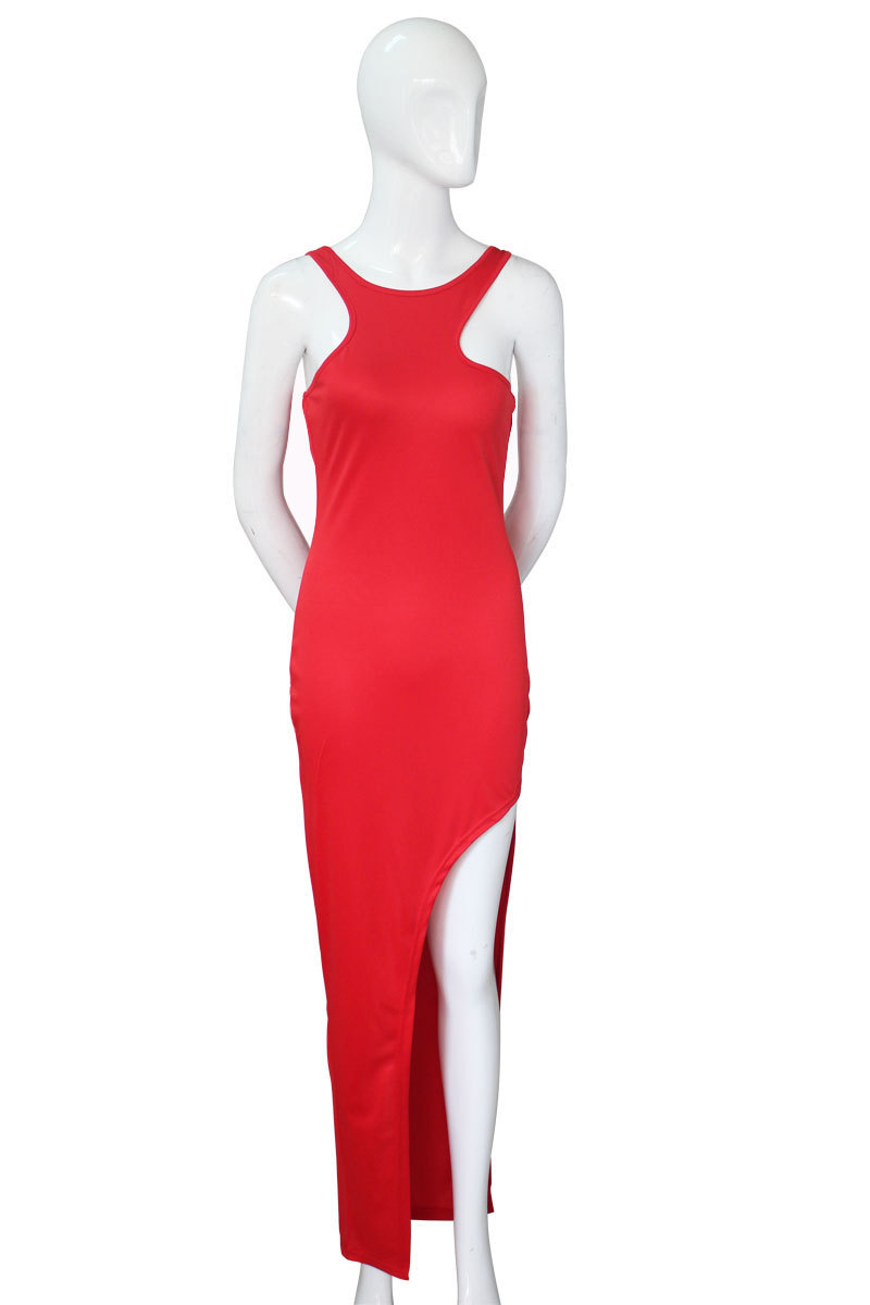 歐美新款性感修身不對(duì)稱背心長(zhǎng)裙 下擺開(kāi)叉連衣裙 Party禮服女