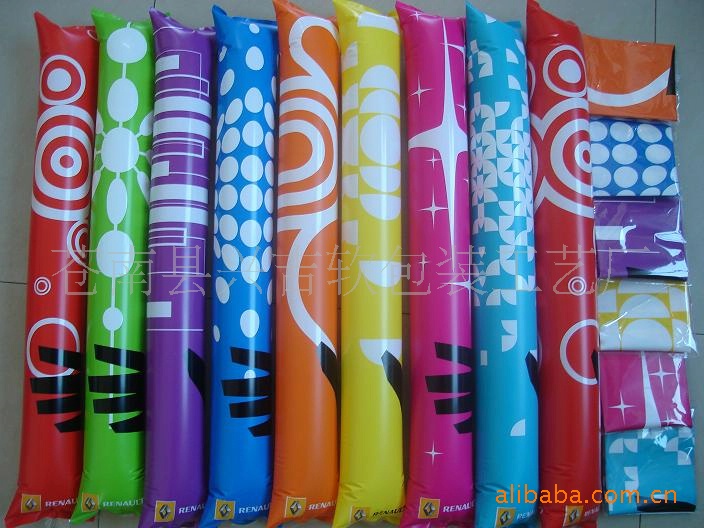 充氣棒用新引進高強度進口PE料制成,拉伸強度為130,耐磨不漏氣,兩棒敲擊可發出金屬音響,制造熱烈氣氛,鼓舞士氣,正反面可印全彩圖案或圖片,8色全自動電腦印刷機,印刷技術高超,色彩鮮艷,更能提高廣告效果.,充氣后自動封口。