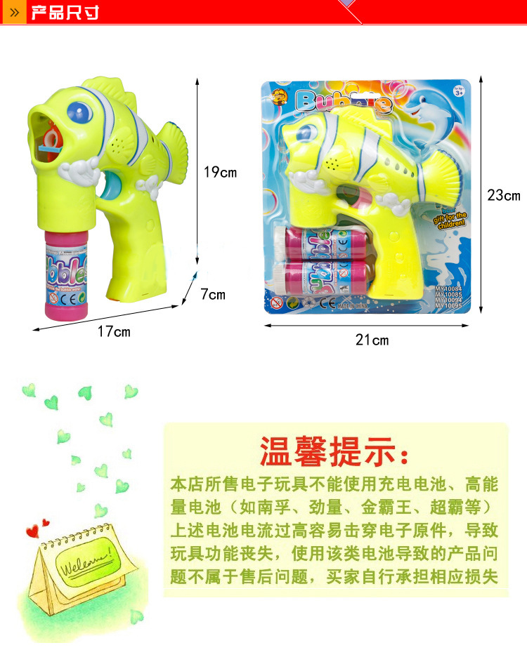 1--裝電池的時候請注意電池蓋上的正負極標示。兩節正極向上,一節正極向下。還有電池用勁電的,不要用差勁的電池,要不有可以會發不出泡泡來,因為抽力不夠,請買家注意使用好點的電池(此類商品不推薦使用南孚 金霸王等高容量電池.由于電壓高于1.5V 導致電機非正常運轉,吹不出泡泡或者出現時有時無等現象)。