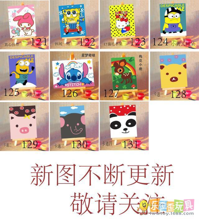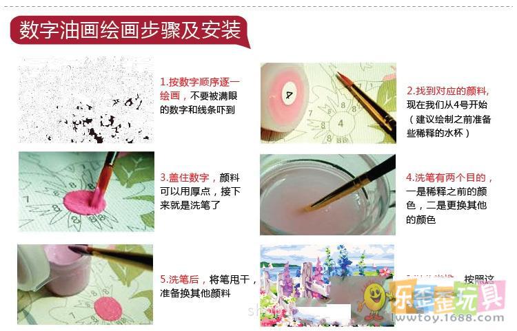 每條顏料條上都粘貼有數字標貼,仔細觀察原始數字畫板上各個小塊的數字號碼,然后選出顏料條中對應的數字顏料用畫筆沾上在畫板上繪制。顏料的顏色數量較多,在繪畫過程中建議先完成一種顏色后,再填第二種顏色,逐步進行繪制。我們的顏料是丙稀顏料,具有一定的覆蓋性,即使您填錯了顏色,也可以覆蓋糾正。繪畫過程中如有疑問還可參照樣圖進行繪制。