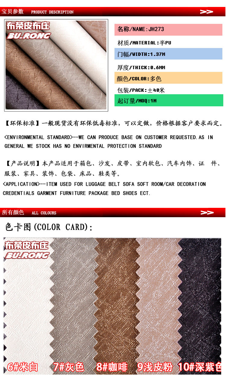 麒翔皮革成立于1999年,公司總部設(shè)立在浙江省義烏市,公司擁有完整科學(xué)的質(zhì)量管理體系。網(wǎng)店布榮貿(mào)易有限公司誠(chéng)信經(jīng)營(yíng)、服務(wù)周到、在業(yè)界得到廣泛的認(rèn)可。十幾年來(lái)本公司專注生產(chǎn)經(jīng)營(yíng)各種PU、PVC、壓花人造革,適用于皮帶、箱包、服裝、證件、商標(biāo)、球類、沙發(fā)、玩具、鞋、工藝品及裝飾。花紋領(lǐng)先獨(dú)特、種類繁多、并配合客戶的產(chǎn)前開(kāi)發(fā)!常規(guī)貨都有大量現(xiàn)貨批發(fā)!