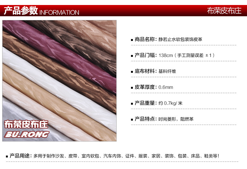 麒翔皮革成立于1999年,公司總部設立在浙江省義烏市,公司擁有完整科學的質量管理體系。網店布榮貿易有限公司誠信經營、服務周到、在業界得到廣泛的認可。十幾年來本公司專注生產經營各種PU、PVC、壓花人造革,適用于皮帶、箱包、服裝、證件、商標、球類、沙發、玩具、鞋、工藝品及裝飾?;y領先獨特、種類繁多、并配合客戶的產前開發!常規貨都有大量現貨批發!