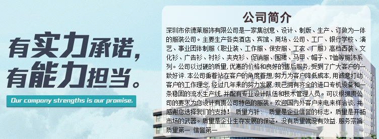 深圳市依德萊服飾有限公司是一家集創(chuàng)意、設(shè)計(jì)、制版、生產(chǎn)、訂做為一體的服裝公司。主要生產(chǎn)各類酒店、賓館、商場(chǎng)、公司、工廠、銀行、學(xué)校、演藝、事業(yè)團(tuán)體制服(職業(yè)裝、工作服、保安服、工衣、廠服)、高檔西裝、文化衫、廣告衫、襯衫、夾克衫、促銷服、圍裙、馬甲、帽子、T恤等服飾系列。