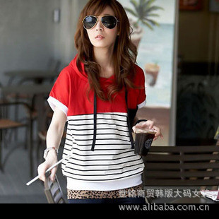 2012新款韓版帶帽條紋短袖t恤 夏裝時尚寬松大碼顯瘦女裝2012款