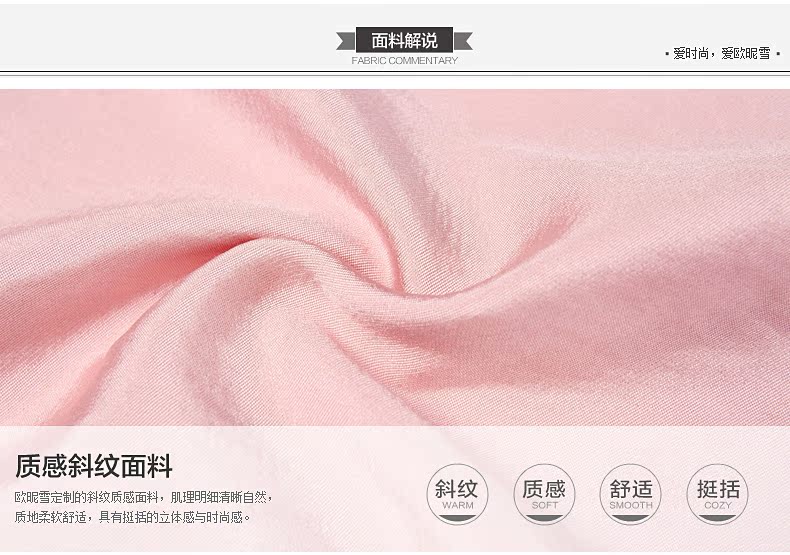 品 牌:歐昵雪產品編號:D1501B35產品顏色:粉色吊牌價格:RMB:888.00產品成份:面料:48%棉 36%聚酯纖維 16%錦綸 袖子料:100%聚酯纖維 里布:95%聚酯纖維 5%氨綸產品說明:衣身有內襯 袖子無內襯 有拉鏈 無鈕扣