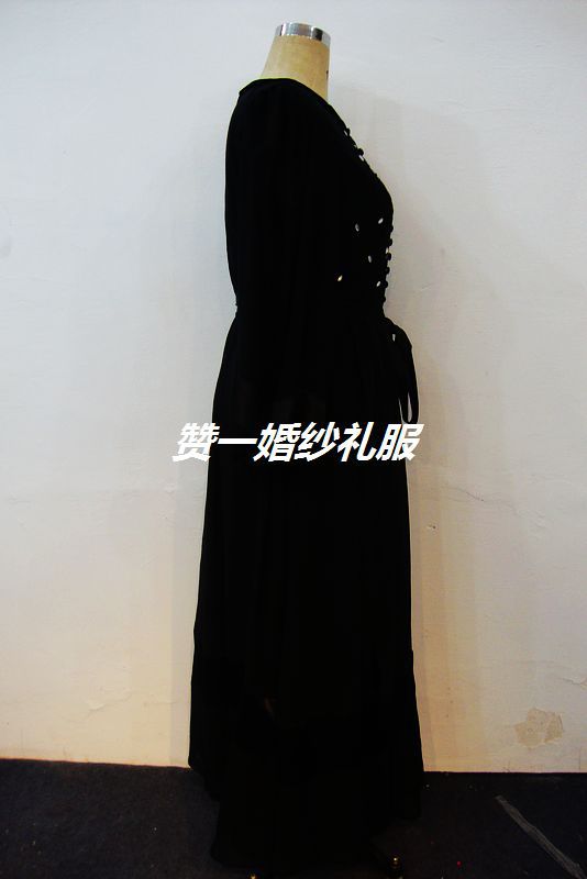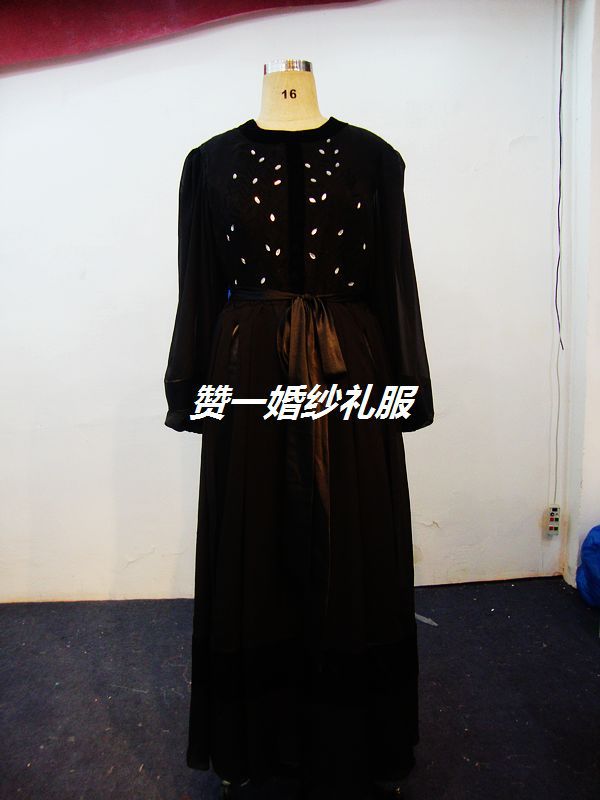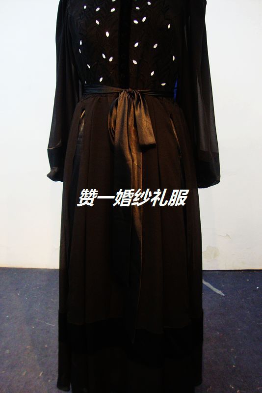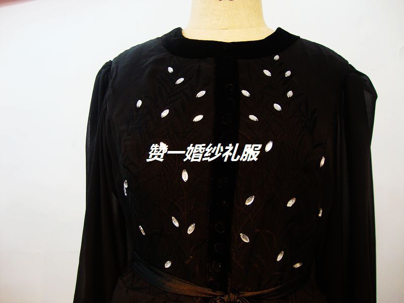 時尚中東新款黑色繡花歐根紗雙長袖晚禮服實拍及原圖對照