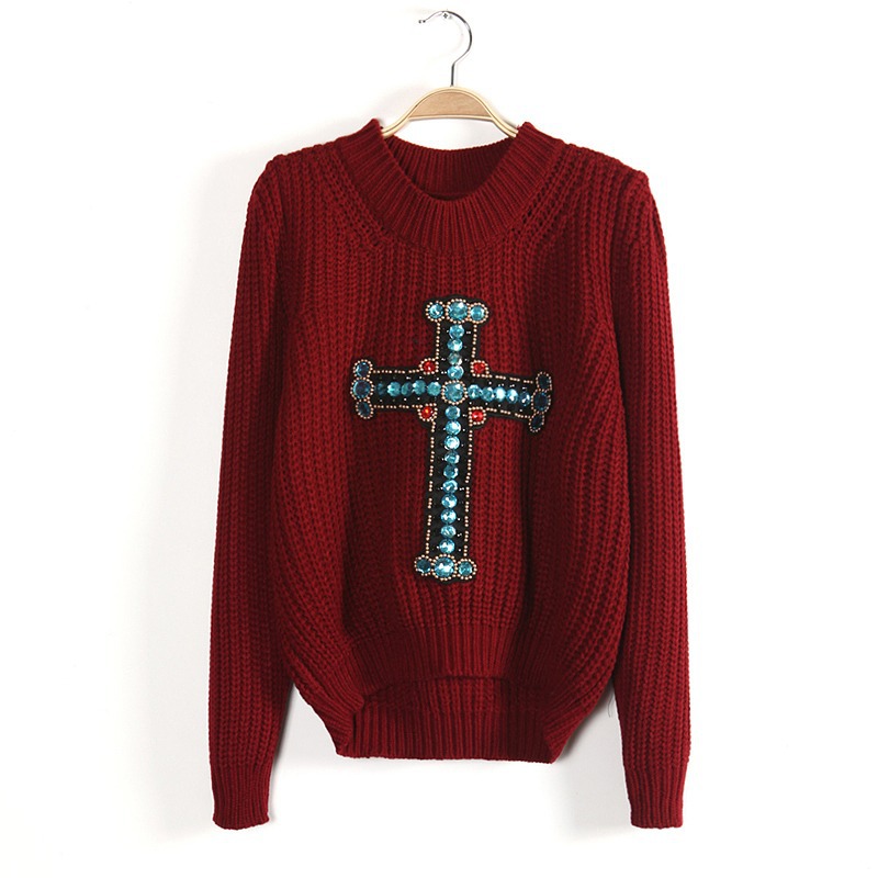 此款衣衣采用毛線面料、柔軟細膩的親膚感、透氣舒適、面料彈性大、豐滿的MM也可穿著的哦、身合身版型、前短后長手工釘珠十字架泡泡袖百搭套頭毛衣、靚麗動人、甜美可愛、雅致秀出玲瓏曲線美感、窈窕迷人、洋氣百搭、無論是甜美系還是休閑風的粉絲們、這款無疑是你們秋冬百搭的選擇單品、推薦喲~~