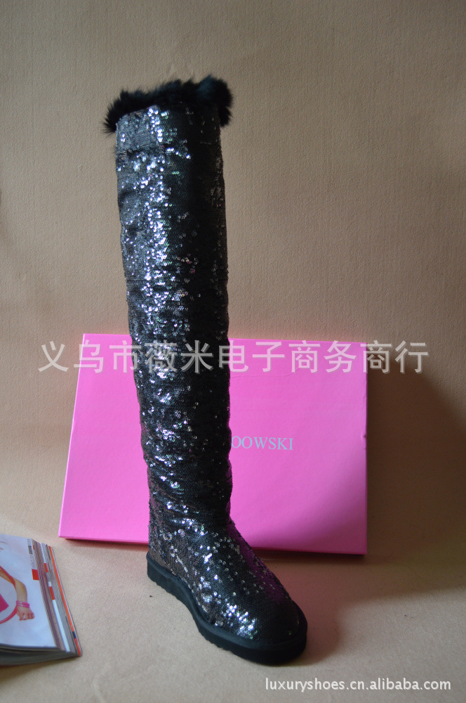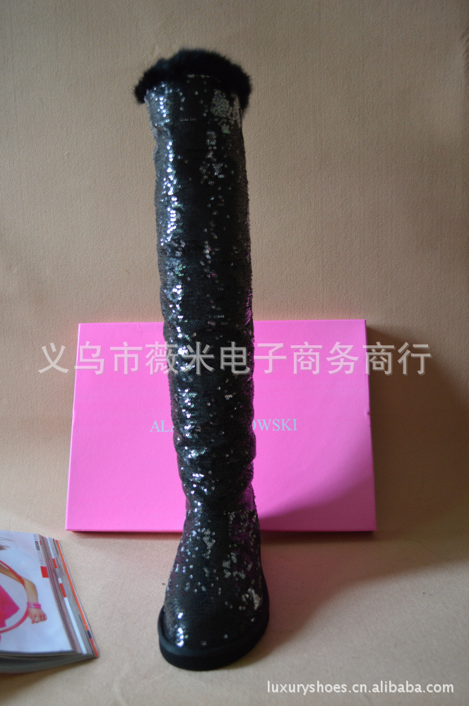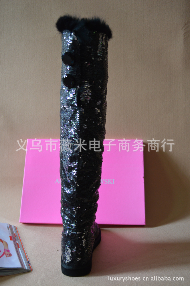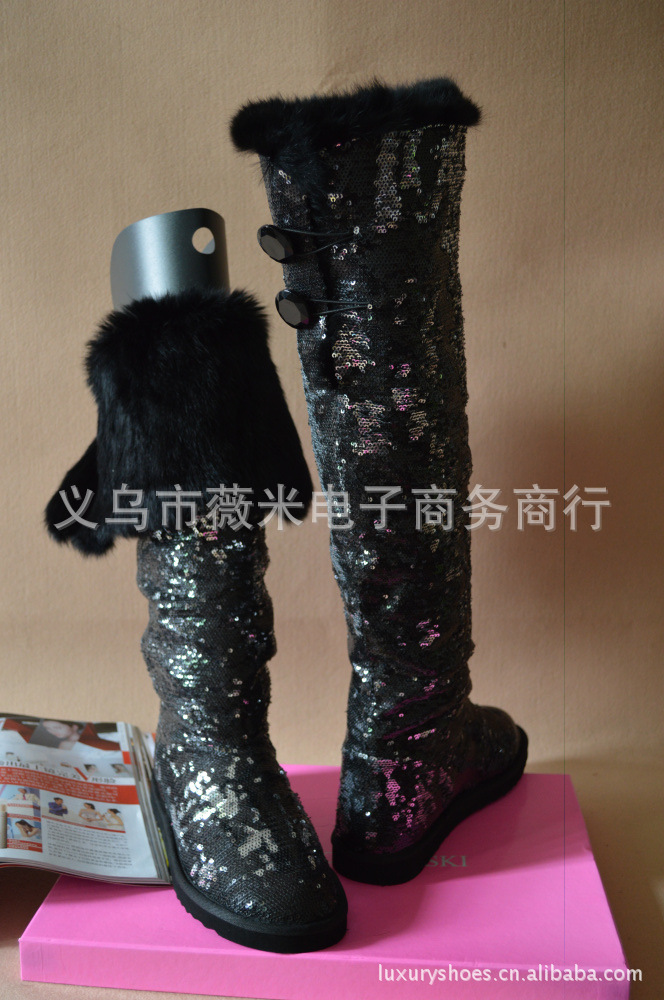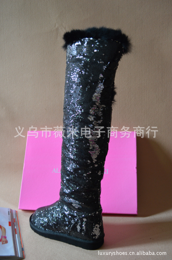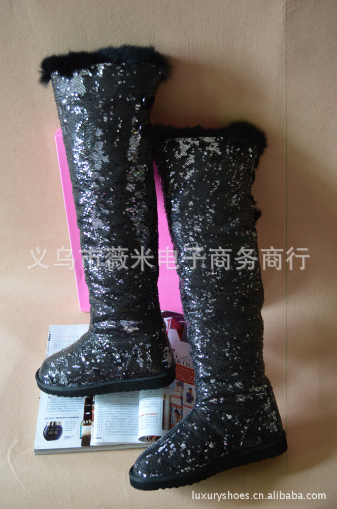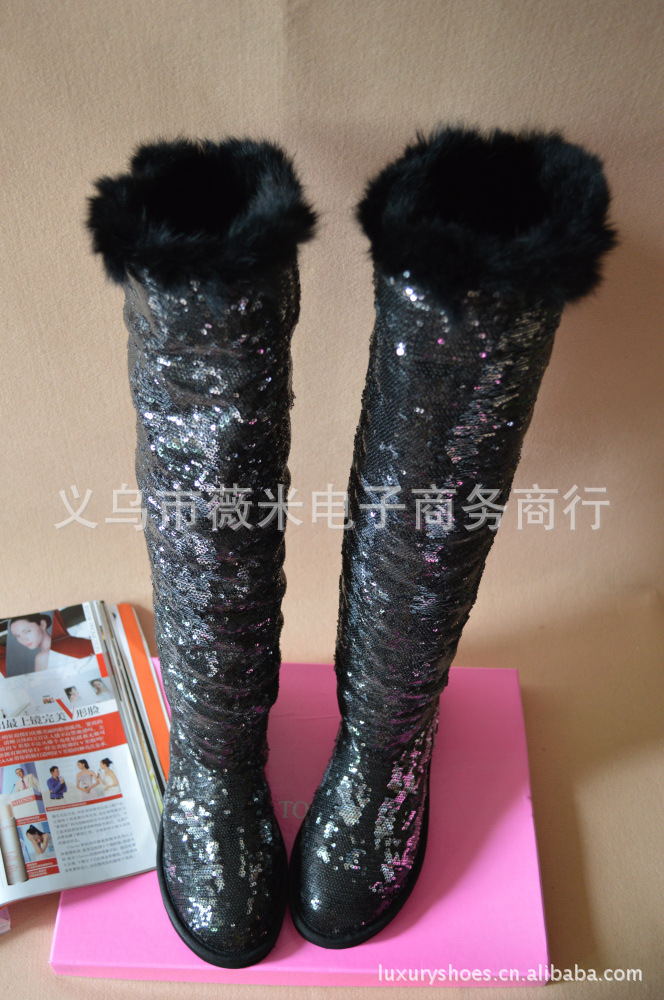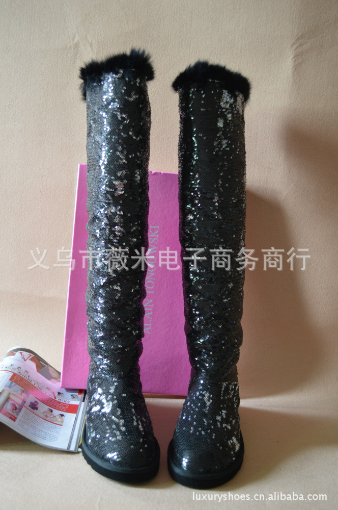 吳佩慈潮鞋個性韓版亮片真兔毛女靴兩穿過膝長筒靴雪地靴 代發(fā)