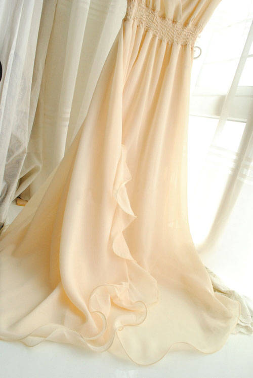 很唯美的一條美裙~這個質地。這個做工。其他店子180以上的價格~裙擺是雙層雪紡的。裙子料子很垂。很墜手。下擺左右兩側,大大的荷葉邊,穿起來很美哦!裙子下擺中間采用n形開叉設計,開叉長度48厘米左右!腰圍是松緊的。裙子很大氣! 氣場很足! 雪紡質地。怎么都不比棉質,。覺得不會露。建議親們穿肉色內衣內褲哈。下擺有上雨絲線!更能體現出裙子的整體效果還有記得要穿高跟鞋喔! 更能突出裙子的飄逸、