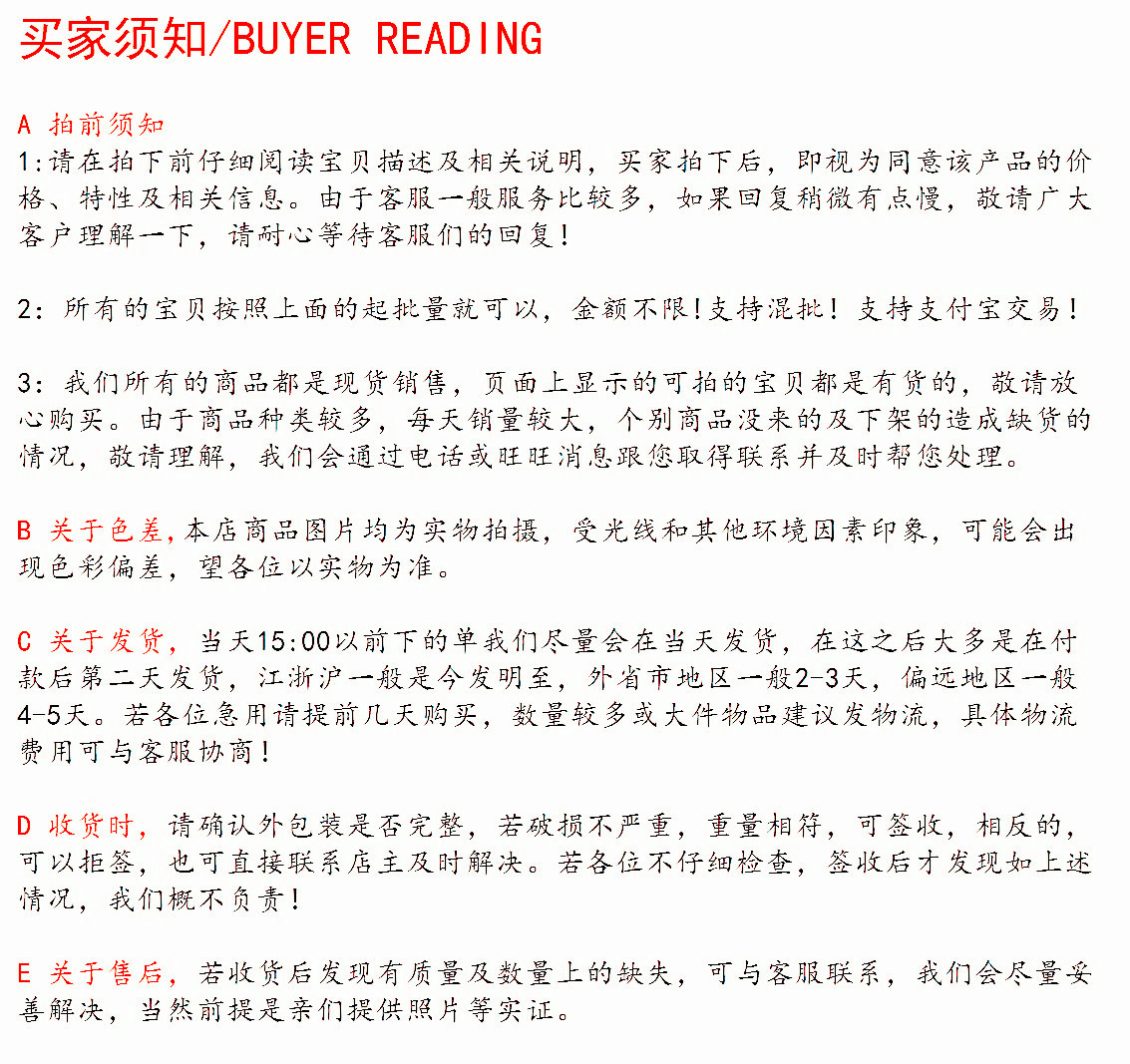 溫馨提醒:本店默認(rèn)快遞是天天快遞,所以運(yùn)費(fèi)模版是按天天快遞的運(yùn)費(fèi)來(lái)設(shè)置的,如果您所在的地區(qū)天天快遞不到的,要發(fā)其他快遞,我們只能按照它們官方價(jià)格發(fā)貨,如果等您拍完付款后再叮囑我們發(fā)其他快遞,我們只能發(fā)天天快遞,或者退款給您,請(qǐng)見(jiàn)諒!