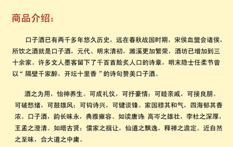 口子窖酒汲取口子獨有的大蒸大回釀造工藝,采用百年老窖與石板 窖發酵,長期窖藏。具有“窖香馥郁、綿甜醇厚、酒體豐富、余味悠長” 的