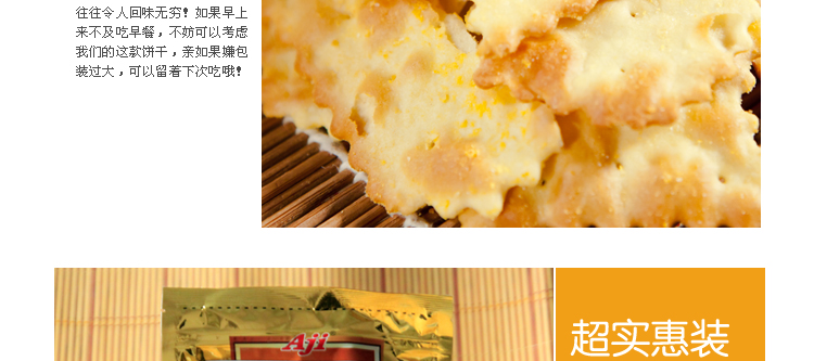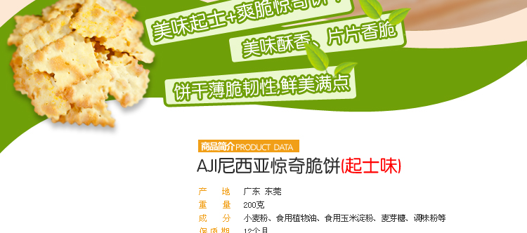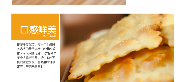 aji采用紐西蘭美味起士,以多道程序添加并結合造型獨特爽脆驚奇餅干,獨門提味配方,創(chuàng)造出驚奇的口味,令人垂涎三尺,給您截然不同的味覺享受!