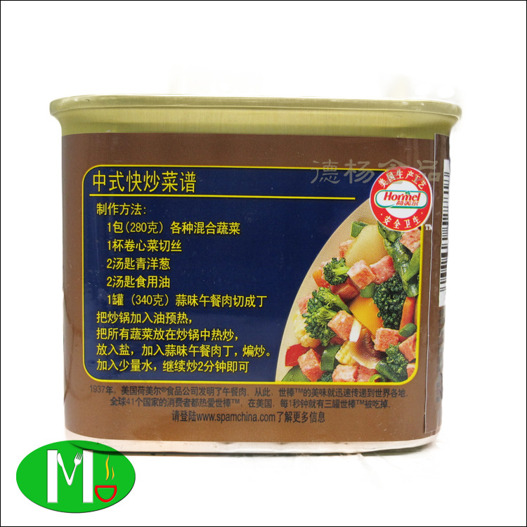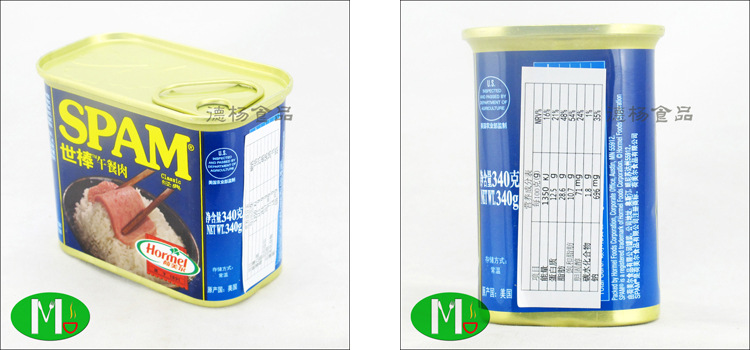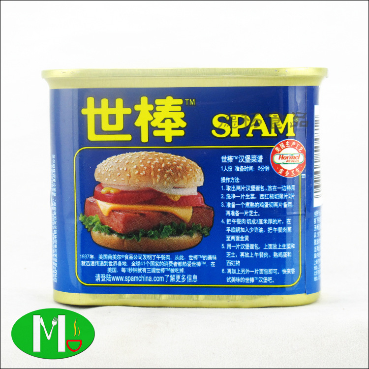 340克午餐肉一罐,生菜和櫻桃番茄作為點綴。鹽和胡椒調味按個人口味添加帕瑪桑芝士(條或者碎),干面包和色拉醬