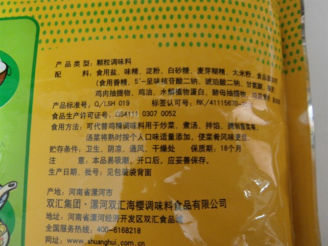 配料:食用鹽、味精、淀粉、白砂糖、麥芽糊精、大米粉、雞肉抽提物、雞油、水解植物蛋白、酵母抽提物、雞蛋黃粉、香辛料等。