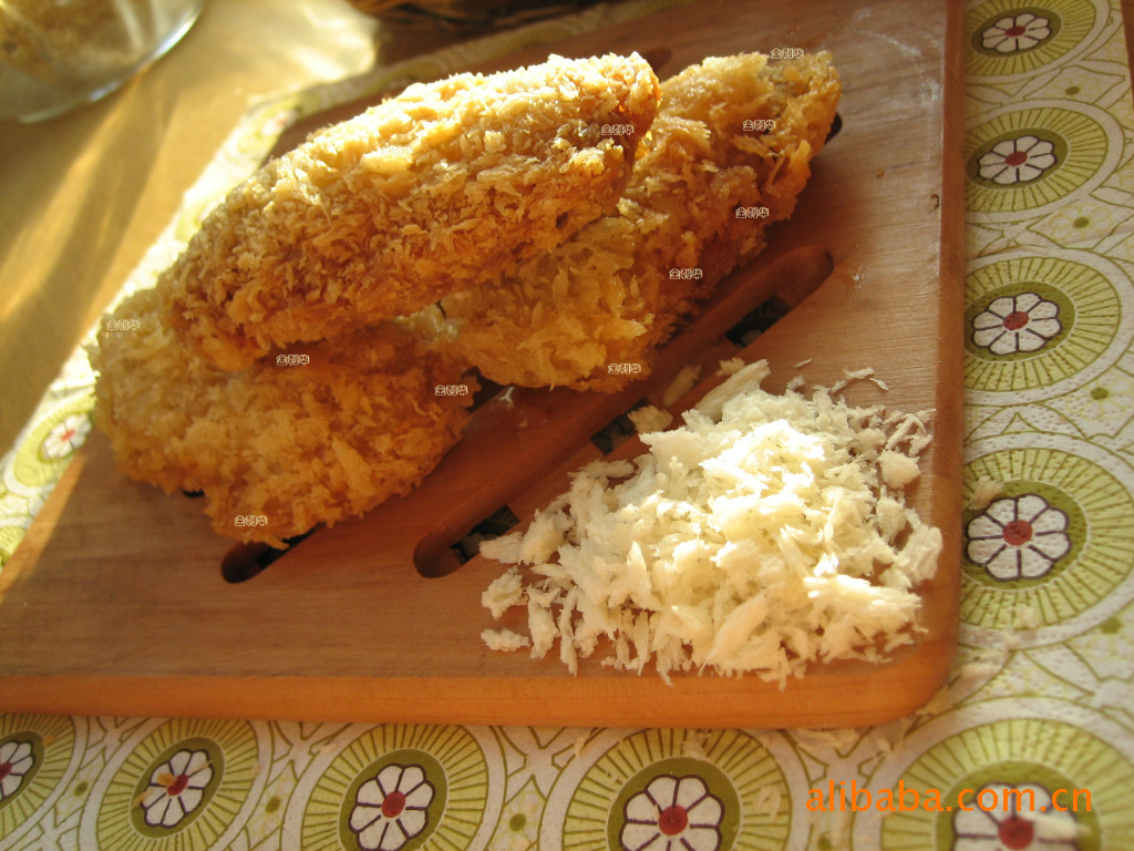 白色長針狀面包糠為業(yè)內(nèi)傳統(tǒng)產(chǎn)品之一,源于日本。該產(chǎn)品及其系列呈中間寬兩頭尖狀,形似繡花針,裹炸而成的魚肉,雞肉等層次感濃厚,接近天賦羅迸發(fā)出的不規(guī)則立體效果。特別是對于面包蝦的制作,炸成品是根根金針排列整齊,有如龍甲鳳羽般映得金碧輝煌,口感更是酥脆有致,震撼齒齦之間。