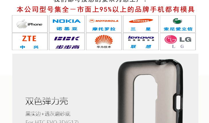 本公司私模雙色注塑保護殼100多款,各種型號各種樣式,可以咨詢索取,根據(jù)您的要求給我們提供色板即可生產(chǎn)!質(zhì)量是合作的基礎(chǔ),本公司的產(chǎn)品是直接給國內(nèi)大型商城及品牌供貨。