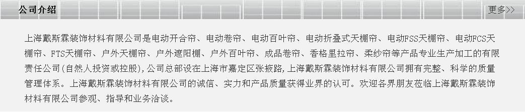 上海戴斯霖裝飾材料有限公司是一家開發(fā)銷售電動窗飾·智能遮陽產(chǎn)品的專業(yè)公司。主要產(chǎn)品有:電動開合簾、電動卷簾、電動百葉簾、電動折疊式天棚簾、電動FSS天棚簾、電動FCS天棚簾、FTS天棚簾、戶外天棚簾、戶外遮陽棚、戶外百葉簾、成品卷簾、香格里拉簾、柔紗簾等產(chǎn)品,專業(yè)生產(chǎn)加工的有限責(zé)任公司(自然人投資或控股),公司總部設(shè)在上海市嘉定區(qū),公司擁有完整、科學(xué)的質(zhì)量管理體系。公司的誠信、實力和產(chǎn)品質(zhì)量獲得業(yè)界的認(rèn)可。歡迎各界朋友蒞臨參觀、指導(dǎo)和業(yè)務(wù)洽談。