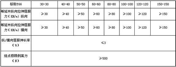 b.凸結(jié)點(diǎn)鋼塑土工格柵規(guī)格型號(hào)根據(jù)拉力的方向,有單向和雙向之分,凸結(jié)點(diǎn)鋼塑土工格柵 每延米拉伸屈服力三十至二百牛不等,可根據(jù)用戶需求而制定。