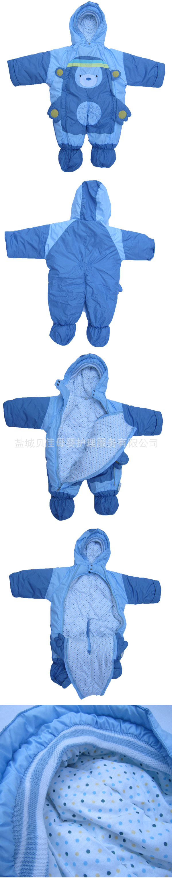 外面是柔軟的就像我們羽絨服的外面的料子一樣,(寶寶如果在穿著過程中弄臟了一點點媽媽們可以用濕布擦一擦,不是很臟的話不用總是洗哦!很方便的!)顏色鮮亮活潑,有藍色小熊和枚紅色小熊兩種,里料是純棉布,夾層是柔軟的保暖絲綿,整個抱服柔軟厚實,寶寶穿上就像蓋著一個軟軟的厚被子!帽子口部有松緊,媽媽們不用擔心寶寶頭部灌風了!
