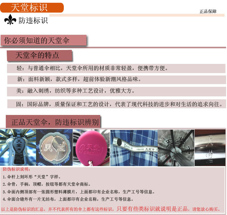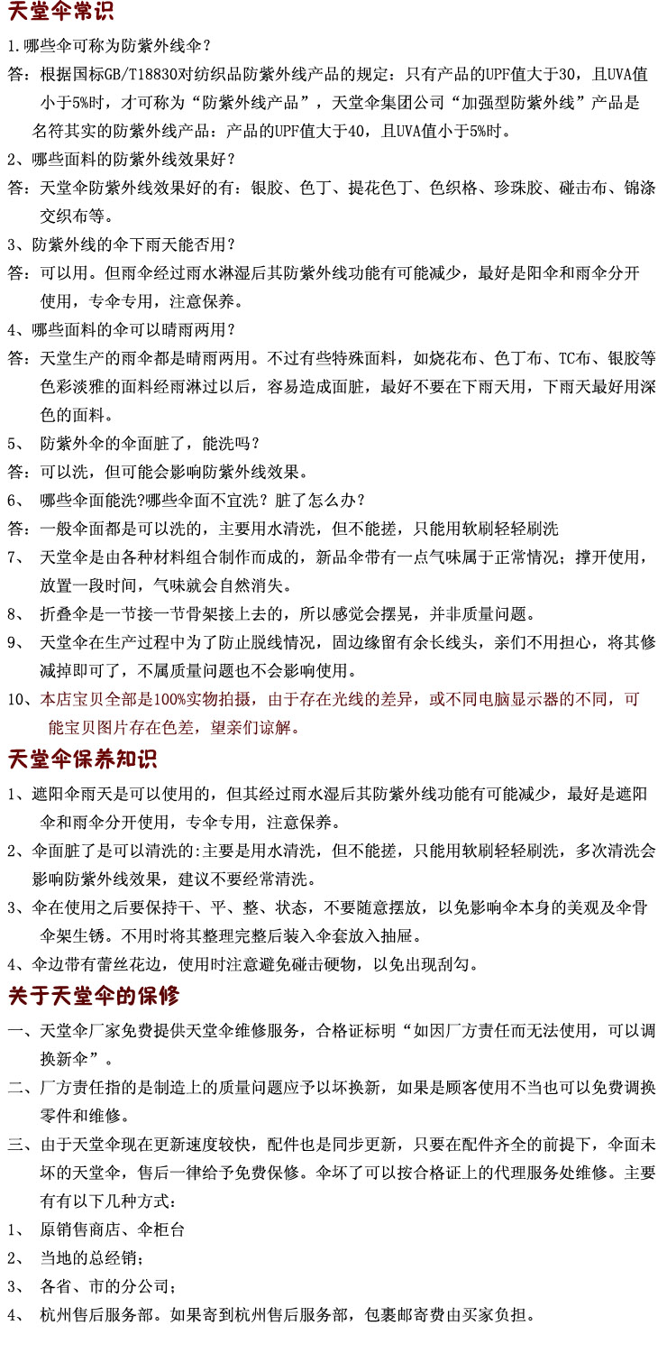 尊敬的客戶 本公司為天堂傘深圳代理商 實力厚雄 本店購買天堂傘 假一罰百 質量問題、終身免費保修 十年批發 品種全、品質優、價格堅持,歡迎廣大新老客戶零買,團購,批發。另本公司常年承接印刷廣告傘訂單。售前咨詢電話:王小姐 售后電話: 林生 小飛 我們的追求,讓每個用戶花少的錢,買到優的產品,貼心的服務