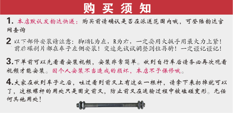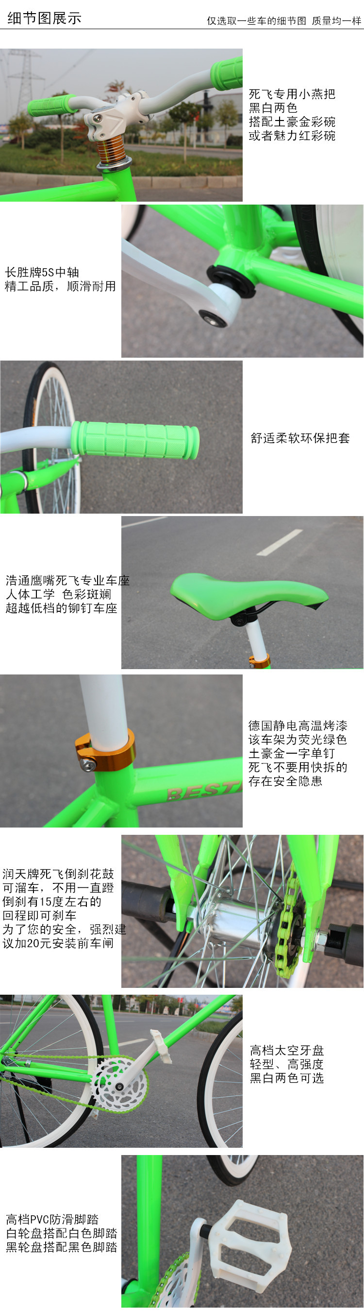 安裝說明:整車90%安裝完畢,超簡(jiǎn)單安裝:只需要安裝前輪,車座,車把即可。所以,親們,再不用為裝車為難了,(一般網(wǎng)上銷售的車子很多為散件,裝起來比較麻煩)此死飛倒騎15度回程則剎車,騎友們都叫它倒剎車,車頭可360度旋轉(zhuǎn),可抬車頭,倒剎漂移等多種基本動(dòng)作,它可以滿足日常生活中的代步,休閑,逛街,郊游!公路車能做的它都可以。