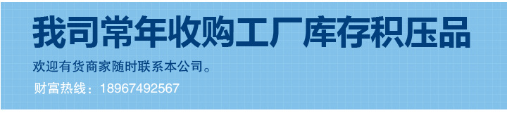 本公司擁有健全的庫存貿易信息網絡,良好的合作商家,廠家,企業和合作伙伴,長期大量供應和需求各類,各檔次的庫存商 品,經營范圍主要包括庫存服裝,品牌服飾,布料輔料,紡織品,皮具,鞋帽,裝飾品,首飾,化妝品,玩具,文具,箱包,工藝 品,禮品,日用品,辦公用品,廚具,家私,體育用品,文化用品,電子產品等各類不限品牌檔次,數量大小庫存商品.本公司一 貫宗旨:誠信服務,效率,建立穩健的網絡.