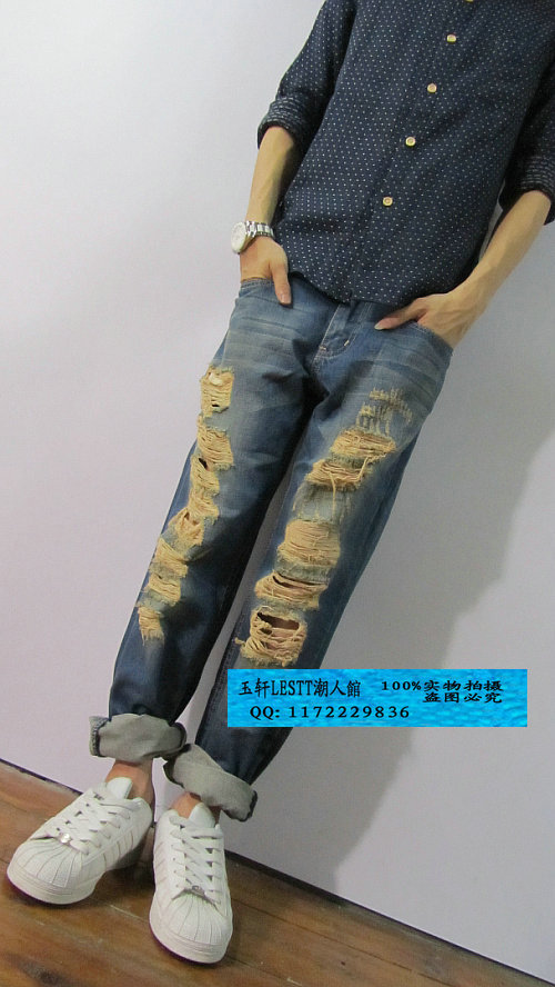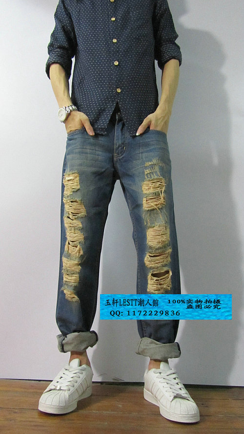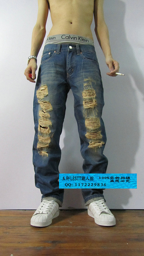 新品秋裝陳冠希潮牌韓版 乞丐破洞牛仔褲 男 直筒牛仔褲 林彎彎