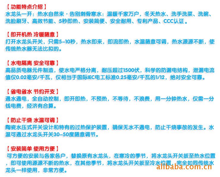 主要特點: 雙重水電隔離,安全可靠。下進水,6秒快熱,鍍亮鉻環裝飾,外形高雅美觀,樹葉式手柄設計,冷熱水雙用,像普通水龍頭一樣,使用方便。配漏電保護器。