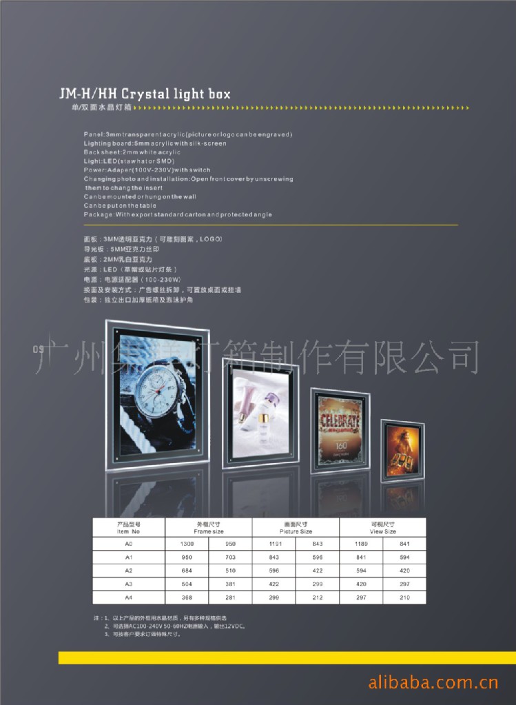 我是廣州集鎂燈箱廠,我司專業生產、超薄、水晶、磁吸、顯示屏走字、感應、吸塑、滾動、動感燈箱及銷售原材料、展示器材、配件等,歡迎來電咨詢。客服電話:工廠:/58/68 移動電話:QQ:1網址:使用范圍:廣泛用于商業中心,超市,專賣店,連鎖,快餐店,酒店,銀行,地鐵,婚紗影樓,賓館,電梯,展廳,櫥窗,辦公家居裝飾。