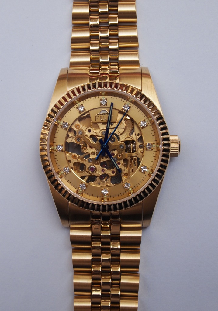 日本316L精鋼表殼、表圈,全實心不銹鋼五珠表帶,殼、圈、表帶真空電鍍18K真金,藍寶石玻璃,日本原裝進口全自動鏤空金機芯,30米防水(鄭重聲明:30米防水不是其他商家說的生活防水,而應(yīng)該是在三十米深的水壓下不進水,因為正歸的工廠在裝配時都會用試水機高壓試水,既然標明3ATM,本身就應(yīng)該達到30米水壓的防水要求,試問:誰能游泳至30米水深處?所以,達到30米防水要求的話,在生活當中是不需要取下來的,除了到海里游泳和高溫桑拿需取下,一般環(huán)境都可以戴在手上,如果商家不敢承諾這點,其產(chǎn)品就帶有虛假的成份!敬請留意!