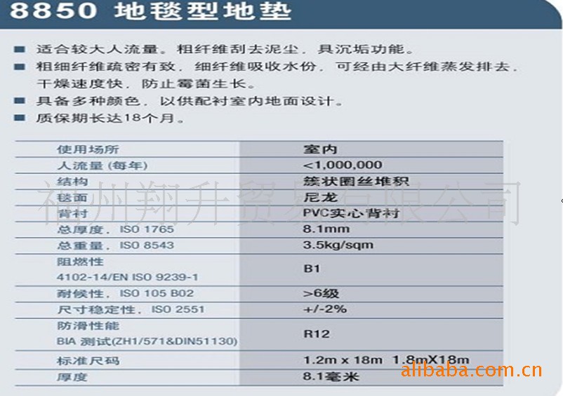 適合較大人流量。獨(dú)具地毯型地墊大小纖維雙重結(jié)構(gòu)特點(diǎn)。大小纖維分別發(fā)揮刮沙和吸水特點(diǎn)。備有多種顏色配襯室內(nèi)地面設(shè)計(jì)。