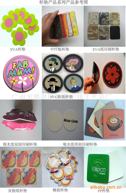 杯墊系列:EVA杯墊、吸水紙杯墊、軟木杯墊、紙板杯墊、PVC磨砂杯墊、PP塑料杯墊等.