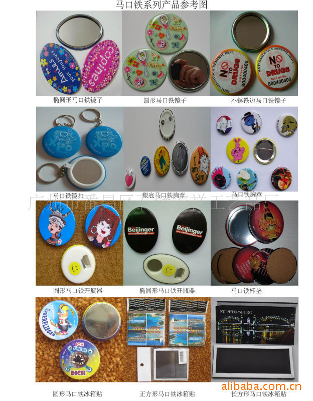 馬口鐵制品類:馬口鐵胸章、徽章、鏡子馬口鐵胸章、開瓶器馬口鐵胸章、馬口鐵冰箱貼等。