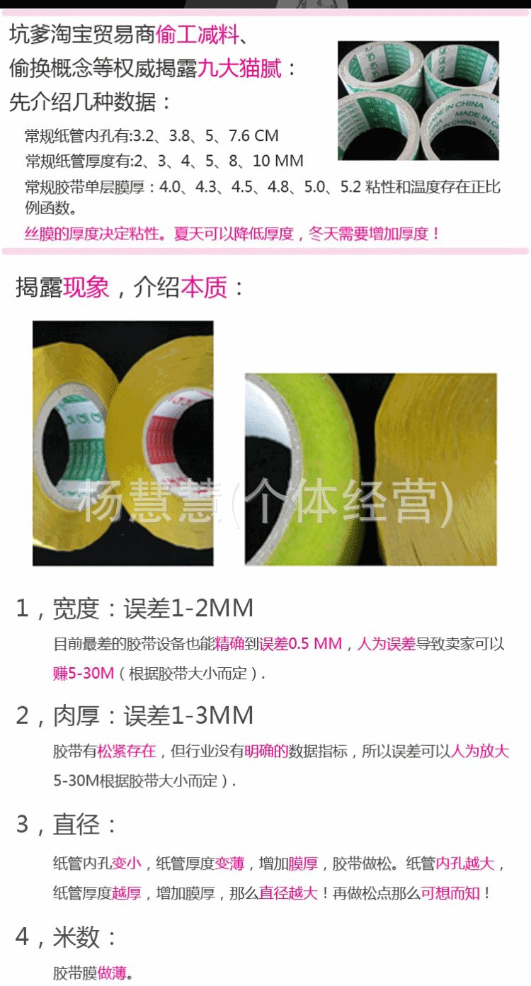 關(guān)于厚度問題解釋:這個問題我相信是親們關(guān)心的問題,因為很多人總是句話問客服就是“你們的膠帶有多厚”,或是“你們膠帶的肉厚有多少”。但是親們并不知道其實在我們業(yè)內(nèi),厚度根本就不是衡量膠帶的一個標(biāo)準(zhǔn),每一家的膠帶做工不一樣,松緊度不一樣,膜的厚度也不一樣!這就造成了有些商家偷換概念,他們不會明碼標(biāo)價說這卷膠帶可用長度多少,他們會說這個肉厚2.5cm或是3cm,但事實上200米的長度可以做到2.5cm的厚度,180m甚至150m的長度也可以做到同樣的厚度!
