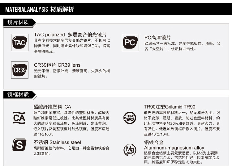 按照國際標準的規定,太陽鏡被列為個人眼部保護用品的范疇,因為太陽鏡是在夏季戴,主要功能是為了遮擋刺眼陽光。然而,國際標準又把太陽鏡細分為“時裝鏡”和“一般用途用鏡”。標準中對“時裝鏡”的質量要求比較低。因為“時裝鏡”主要突出的是款式,佩戴者注重的是裝飾,而不是保護功能。標準中對“一般用途用鏡”的質量要求則比較嚴,其中包括對防紫外線,以及屈光度和棱鏡度的指標要求。