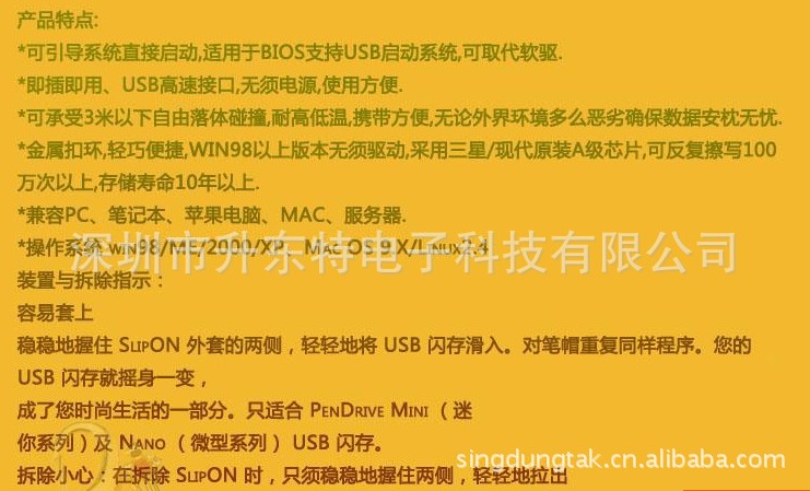 可應(yīng)用范圍:1)促銷禮品 2)專業(yè)銷售工具3)網(wǎng)上市場調(diào)查4)在線產(chǎn)品目錄冊5)新會員、新學(xué)員網(wǎng)上召募6)網(wǎng)上產(chǎn)品、政策法規(guī)宣傳7)重要時刻饋贈的紀念禮品:商務(wù)禮品/展會禮品/電子禮品/會議禮品/員工福利禮品/可代理客戶在禮品上印刷上公司名字,LOGO,電話,廣告語等,U盤內(nèi)可植入廣告/圖片/PPT/視頻等宣傳資料。產(chǎn)品優(yōu)勢:1)高科技產(chǎn)品倍受歡迎 2)可以是任意款式外型 3)十分經(jīng)濟實惠 4)出人意表的進入特定網(wǎng)站的方式5)廣闊的市場潛力。