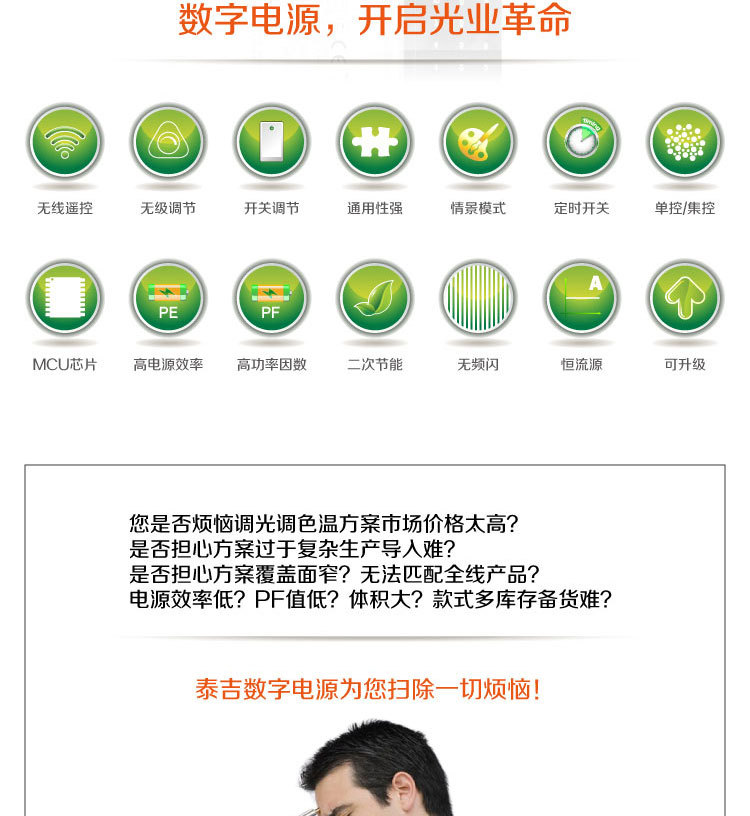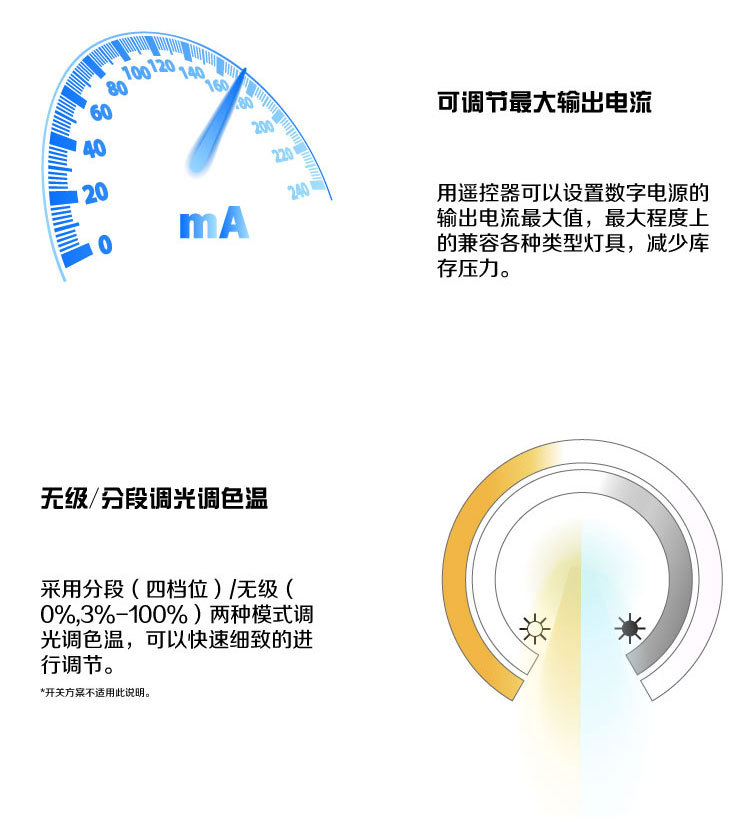 二次節能、自動調光:1、實現分段/無級調光調色溫,自由選擇3%-100%調節亮度,更節能,自由設置區域照明效果。