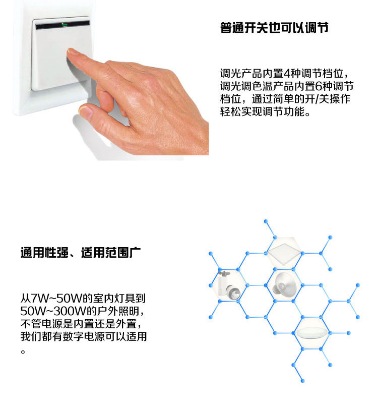 單獨/集中控制: 完美實現單控/組控/集控等多種控制功能,可單獨控制某一盞燈具,集中控全部燈具,1個遙控器同時控制無數盞燈。操作簡易:同時兼容多種控制方式,墻體普通開關調節、無線遙控調節、觸摸面板二次節能控制。距離可達20米以上。